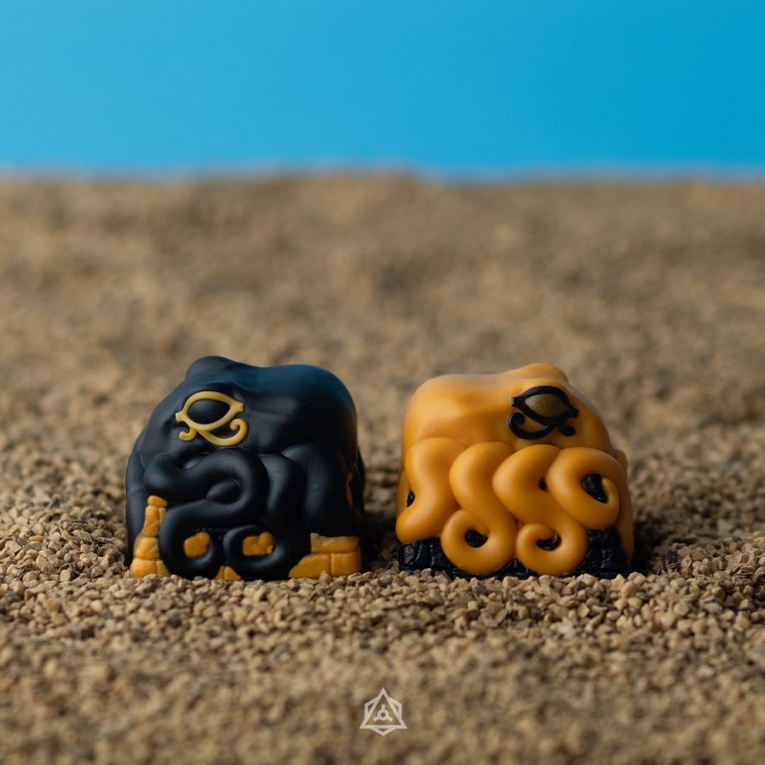 Introducing our collaboration for SXM Designs’ GMK Pharaoh Keyset. Kolkrobba and Xiro make a return as their Pharaoh alter egos donning a stunning yellow and black set of embellishments to compliment the theme of this set.