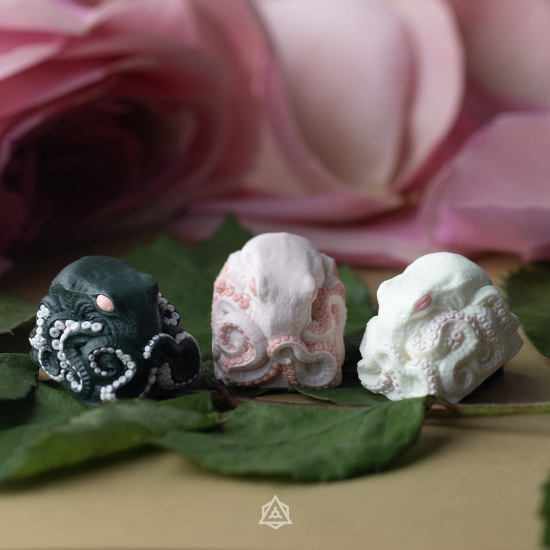 Introducing our collaboration for Adobau Labs’ KAM Bouquet Keyset. Featuring Xiro in her floral alter ego and our detailed Kolkrabba sculpts. This colorway features three variations for each sculpt complementing the beautiful green and pinks within KAM Bouquet.
